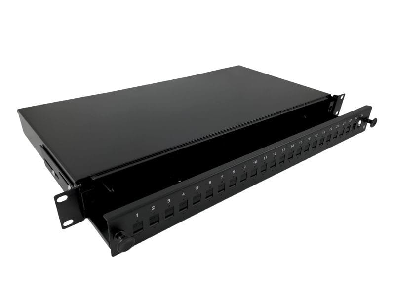 Fiber optic panel with retractable tray for mounting in 19" racks and racks, 24 SC simplex ports, black.