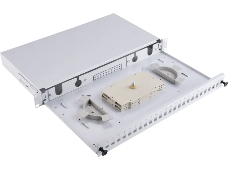 Fiber optic panel with retractable tray for mounting in 19" racks and racks, 24 SC simplex ports, gray.