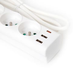 The Fiesta power strip features three grounded sockets and three USB ports, including one USB-C, for convenient device charging. The cable is 3.0 meters long and has a rated current of 10A. It features an illuminated power button and a built-in varistor that protects against surges. This white product, ideal for home and office use, ensures safety and versatility. Our product is a modern power strip with surge protection. Thanks to the built-in varistor, the strip protects your devices against sudden voltage spikes, which is especially important for delicate electronics. At the moment of a sudden voltage increase, it absorbs excess energy, preventing damage to connected devices.Technical specificationsLength: 3M3 socketsA French standard10A250V2x USB, 1x USB-CVaristor - surge protection.