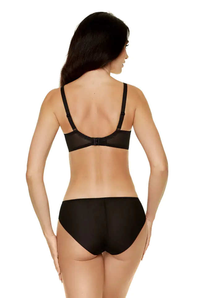 Kuszący biustonosz z miękkimi miseczkami zapewnia atrakcyjnie wyglądający dekolt. Miseczki wykonano z tiulu elastycznego, obszytego ozdobnym haftem.