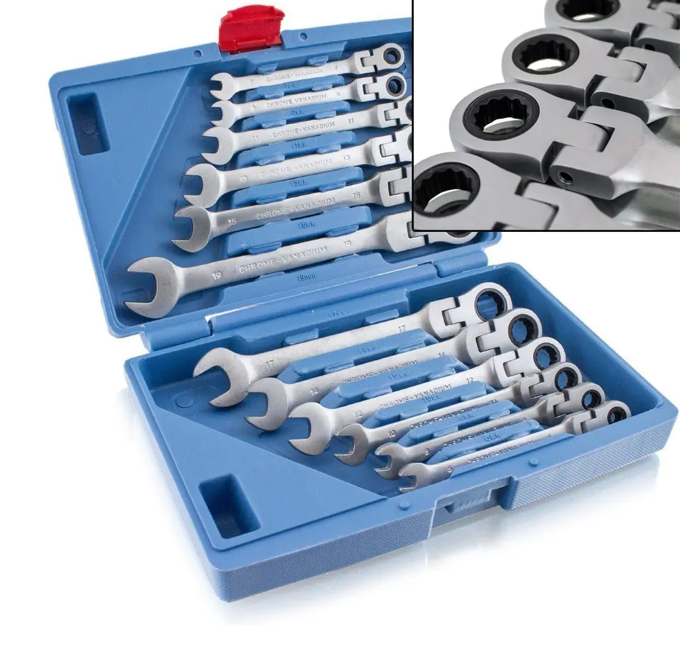 Set of 12 flat combination wrenches with joint. The tools are made of hard chrome-vanad steel resistant to damage.