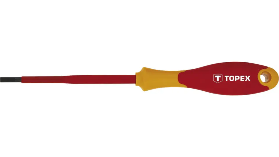 Flat screwdriver 1000V TOPEX (ref. no. 39D472) in size 4 x 100 mm. Designed for work under voltage up to 1000V. Made of high quality chrome-molybdenum steel, insulated. Ergonomic plastic handle covered with non-slip material for comfort and safety during operation. The TOPEX brand is addressed to DIY enthusiasts.