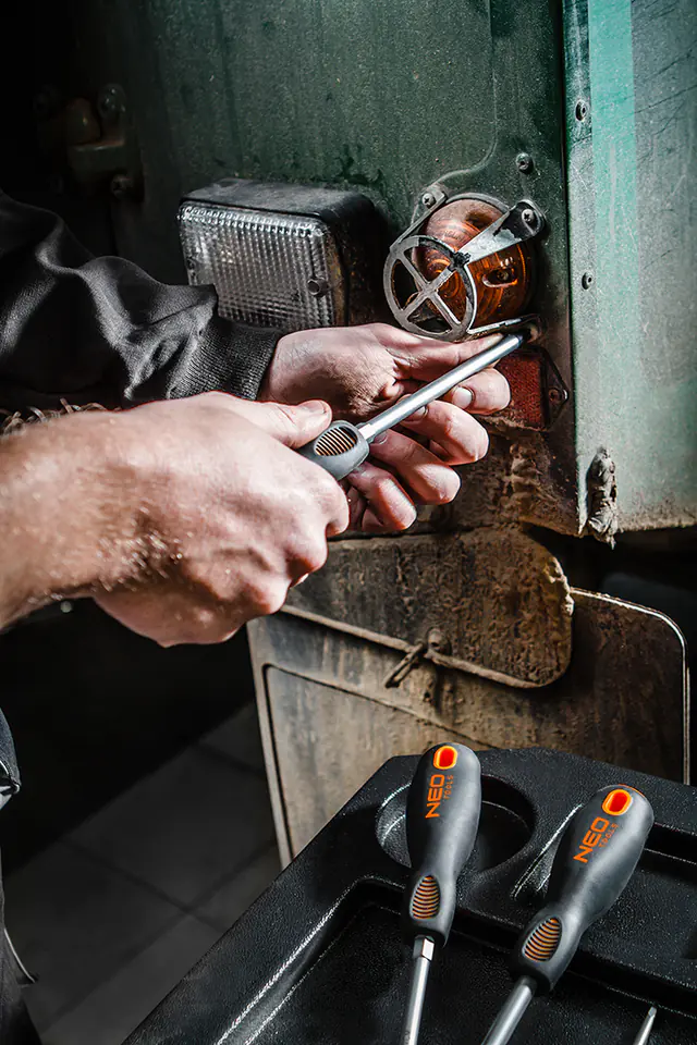 NEO flat screwdriver (ref. no. 04-015) with dimensions of 6.5 x 150 mm. The tip of the screwdriver is made of extremely durable S2 steel. The working tip of the tip has been heat treated, thanks to which adequate hardness and bend resistance of 56 HRC have been obtained. The screwdriver has a magnetic tip. The triangular shape of the handle with contoured thumb rest reduces the strain on the hand during operation and makes it easy to achieve optimal torque. The two-material handle prevents slipping in the hand, is resistant to chemicals, oils and greases. The quality of the tool is confirmed by the TÜV certificate and a 25-year manufacturer's warranty. The NEO brand meets the expectations of professionals.