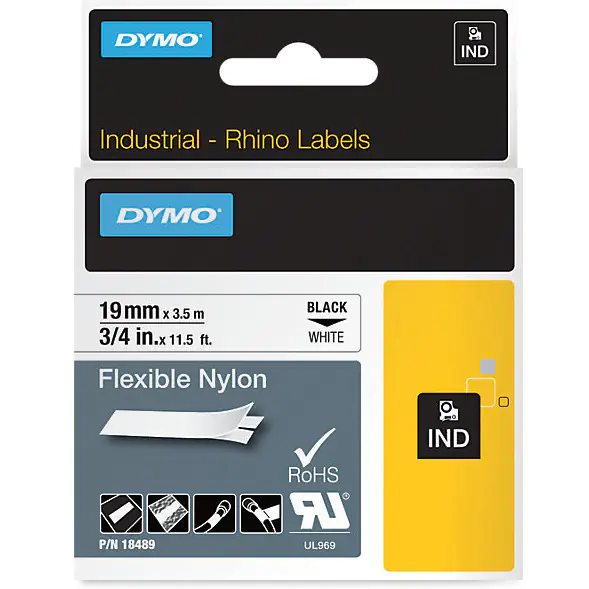 Rhino flexible nylon tapes are used on smooth or rough surfaces. Labels adhere tightly to wires, cables, rounded surfaces. Tear-resistant material is not damaged when pulled through small holes or tubes. They are perfect for marking patch machines, equipment devices. They are RoHS compliant. UL certified as a component of UL 969. They have an easily removable protective layer. They are resistant to temperature (from -10 to +80°C).