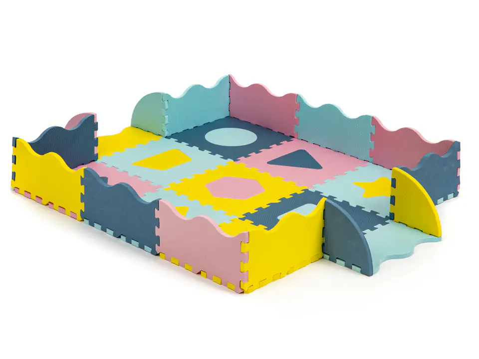 Since the mat connects like a puzzle, you can build a tower, a cube and other structures that the child will come up with. Each shape can be removed from the square, so you can play with their arrangement and fitting, and in addition, the toddler will have the opportunity to learn how to recognize them.