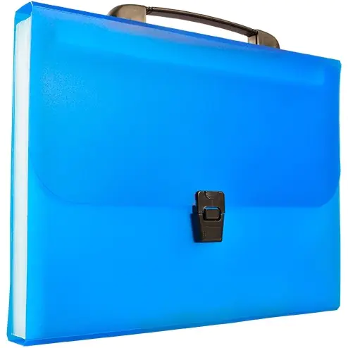 PP folding folder with handle, fits A4 format, has 13 compartments. Dimensions of the folder: 330x265x33 mm, thickness of PP plastic: 0.60 mm. Available in four colors (blue, red, orange, yellow). Packaging: foil 1 pc.