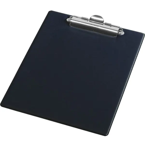 Rigid front and back cover made of very light cardboard coated with ecological PVC foil, equipped with a serrated clamping clip, on the inner side the cover has a transparent foil pocket and space for a pen, for writing notes capacity 100 pages
