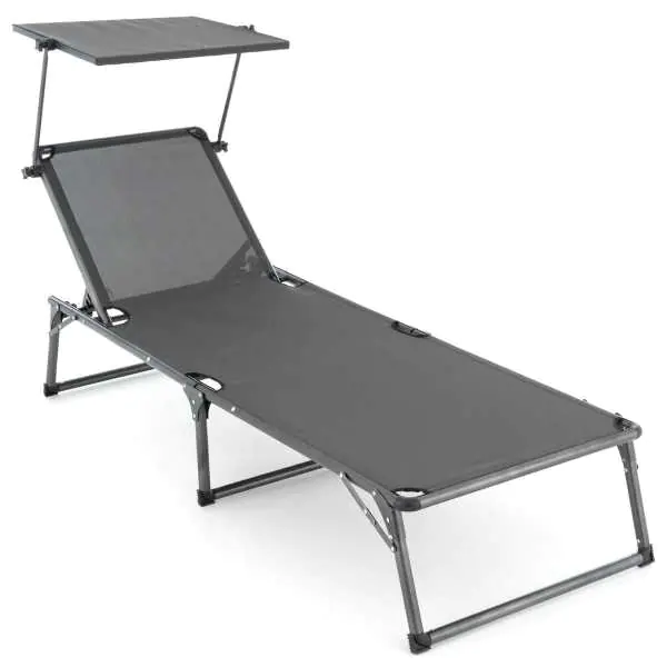 Folding four-poster deckchair black 192x66x31 cm Folding bed with 5-step adjustment and comfortable lying surface. The tilting roof is a practical shade and can be individually adjusted. The deckchair is covered with easy-to-care waterproof 2x2 Textilene 600g polyester. The stable grey aluminium frame with three legs is extremely durable. Non-slip feet with protective pads also provide a stable grip.The bed is foldable and can be stowed away to save space. Thanks to this, it can also be easily transported. Specification: Dimensions: 192x66x31 cm Dimensions after folding: 80x66x17 cm Dimensions: 57x51 cm 5-step backrest adjustment Color: black Maximum load: 120 kg