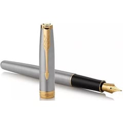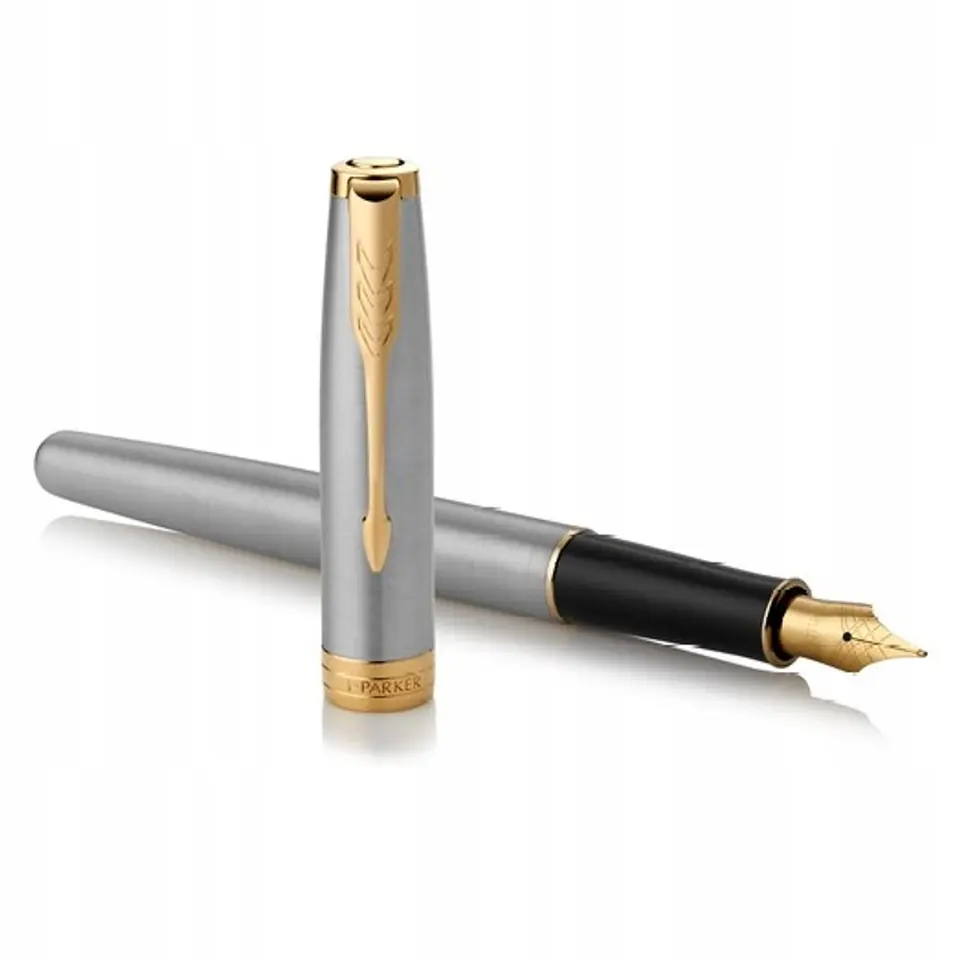 PARKER Sonnet Stainless Steel GT fountain pen, stainless steel with gold trim, fine nib, black ink, gift packaging.