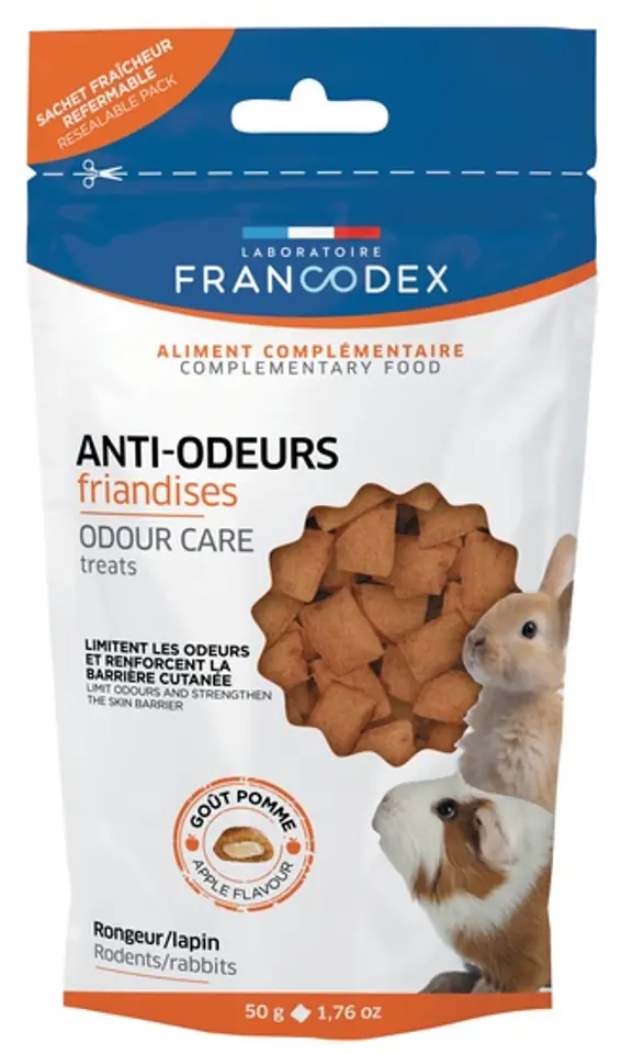 FRANCODEX odour prevention snacks contain yucca to reduce the unpleasant smell of urine and digestion, as well as brewer's yeast to strengthen the skin barrier and reduce unpleasant odors from the animal's coat. The crispy crust and soft flesh make snacks associated by animals with a pleasant time spent together.