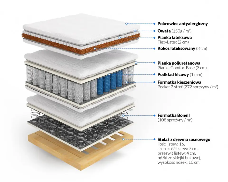 The Hera mattress is a continental mattress, the construction of which is a combination of bonella and pocket springs. On top of the spring mattresses, a 3cm thick latex coconut overlay and 2cm thick FlexyLatex foam were applied. The bonella mattress, which is mounted on the frame, has 108 pcs. springs per m2, the mattress placed on it is a pocket mattress, which in its construction has as many as 272 pcs. springs per m2. The middle mattress with pocket springs has been divided into 7 hardness zones. The topper mattress is a combination of coconut mat and latex. The mattress is equipped with a classic pine wood frame, with the possibility of screwing legs with a height of 10 cm. The total height of the mattress together with the legs of 10 cm is about 53 cm. Production and shipment of the mattress takes place within 14 working days of posting the amount to our account. The warranty is 10 years for the spring insert.