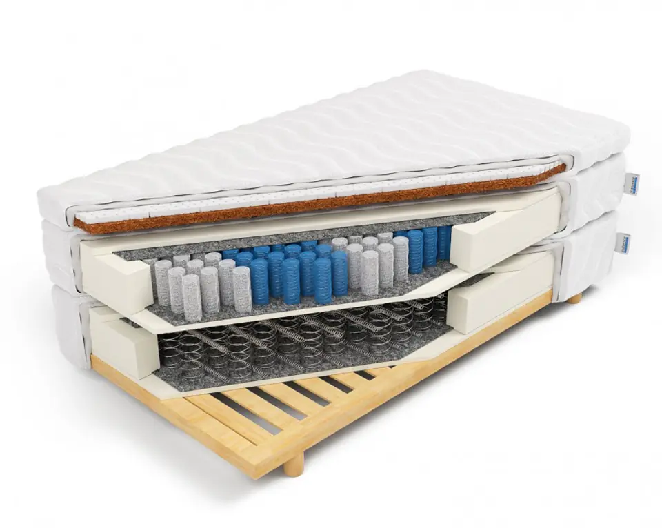 The Hera continental mattress is made from a combination of three different layers - mattresses with different properties. Each of these mattresses is in a cover. From the bottom there is a bonella type mattress, it is a spring mattress, with high flexibility and durability. It is made of hourglass-shaped springs, additionally connected to each other, thanks to which it is resistant to heavy loads. A pine wood frame is also built into this layer. The second layer is a pocket-type mattress. In this model, each spring is sewn into a separate pocket, thanks to which only the springs on which we lie work. The whole is arranged in 7 hardness zones to provide adequate support for the whole body, as well as sleep comfort. This solution is recommended for couples, during sleep we do not feel the movements of the other person. The upper mattress consists of two elements, the lower one is a 3-centimeter latex coconut insert, which gives the mattress the right hardness. Coconut also has anti-allergic and antifungal properties, and is also resistant to deformation. At the very top of the mattress there is a 2 cm FlexyLateks foam insert, which is also built zonally - in the cross section it puts more resistance than in the area of the legs and head. This layer provides adequate support for the body during sleep, and its advantage is anti-allergic properties.