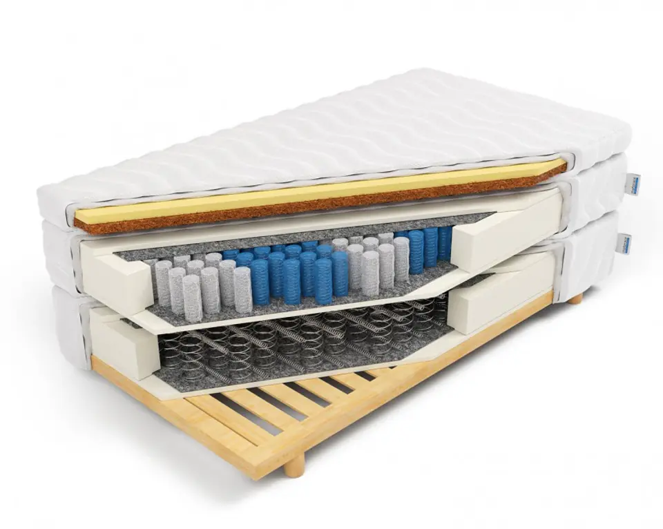 Galatea is a mattress that combines three different layers. Each of these layers has a separate anti-elegant cover. The bottom layer is a bonella mattress, the arrangement of springs of which gives us an extremely flexible surface to sleep. They are very durable and resistant to heavy loads. In addition, this layer has a built-in pine wood frame. The frame has the ability to screw legs with a height of 10 cm. Each order is accompanied by a set of legs. The middle layer is a pocket mattress with 7 hardness zones. Each of the springs is sewn in a separate pocket and properly arranged in zones. This distribution ensures perfect support for all parts of the body. This system is especially recommended for couples, there is no effect of the mattress collapsing towards a heavier person. The third layer consists of two components. Below is a 3 cm insert in the form of latex coconut, which increases the degree of hardness of the mattress. The coconut mat is also extremely durable, resistant to deformation, thanks to which the mattress is airy. Proper air circulation makes the mattress breathable and anti-allergic. The last component is a 2-centimeter Insert made of PerfectSuite foam (VISCO/memory), which has thermoelastic properties. When we lie down on the mattress, under the influence of the heat of our body, the foam adapts to its contours, when it loses heat it returns to its original shape. Thanks to this, it prevents pain in the back, neck and shoulder area - places that are particularly sensitive to pressure. All components used in the mattress have anti-allergic properties.