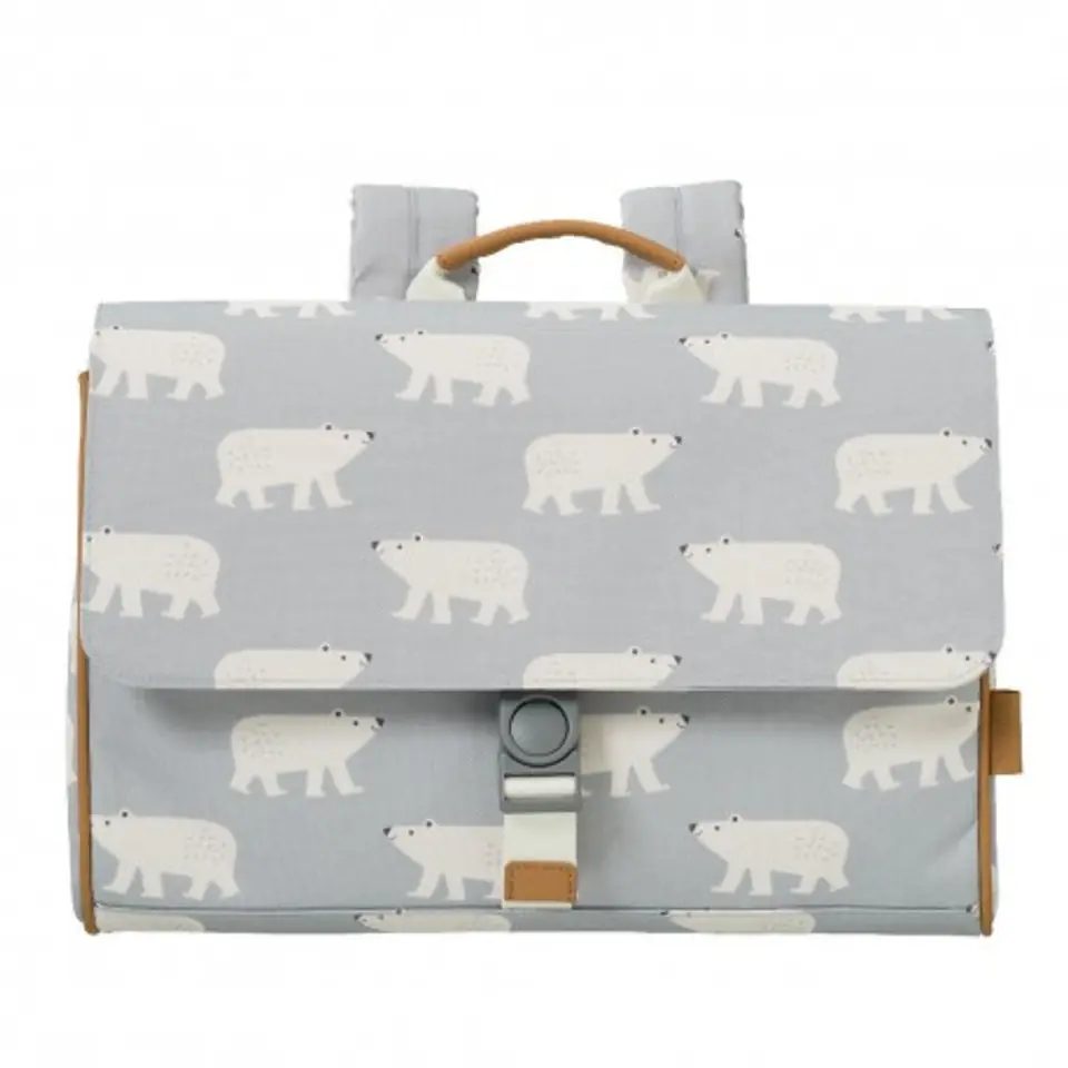 Fresco Schoolbag Polar bear Fresco is a Dutch manufacturer of delightful toys, clothes and accessories for children produced in accordance with the idea of sustainable development. The brand's philosophy is responsible and thoughtful production planning minimizing the negative impact on our environment. The fresco is a combination of recognized design and excellent quality. Organic, natural materials provide comfort and environmental protection. Characteristics Beautiful and handy schoolbag Fresco for young students. The satchel has a capacious main compartment with a practical pocket and a zippered inner compartment, and a separate compartment under the flap. Perfect for kindergarten, school or a trip. The backpack is fastened with a convenient snap, with an adjustable buckle, has the ability to adjust the harness and a comfortable handle to hold. In the middle of the satchel there is a place to enter the name and surname of the owner. Made from recycled PET bottles. Approx. dimensions: 34 x 25 x 8 cm FB960-17