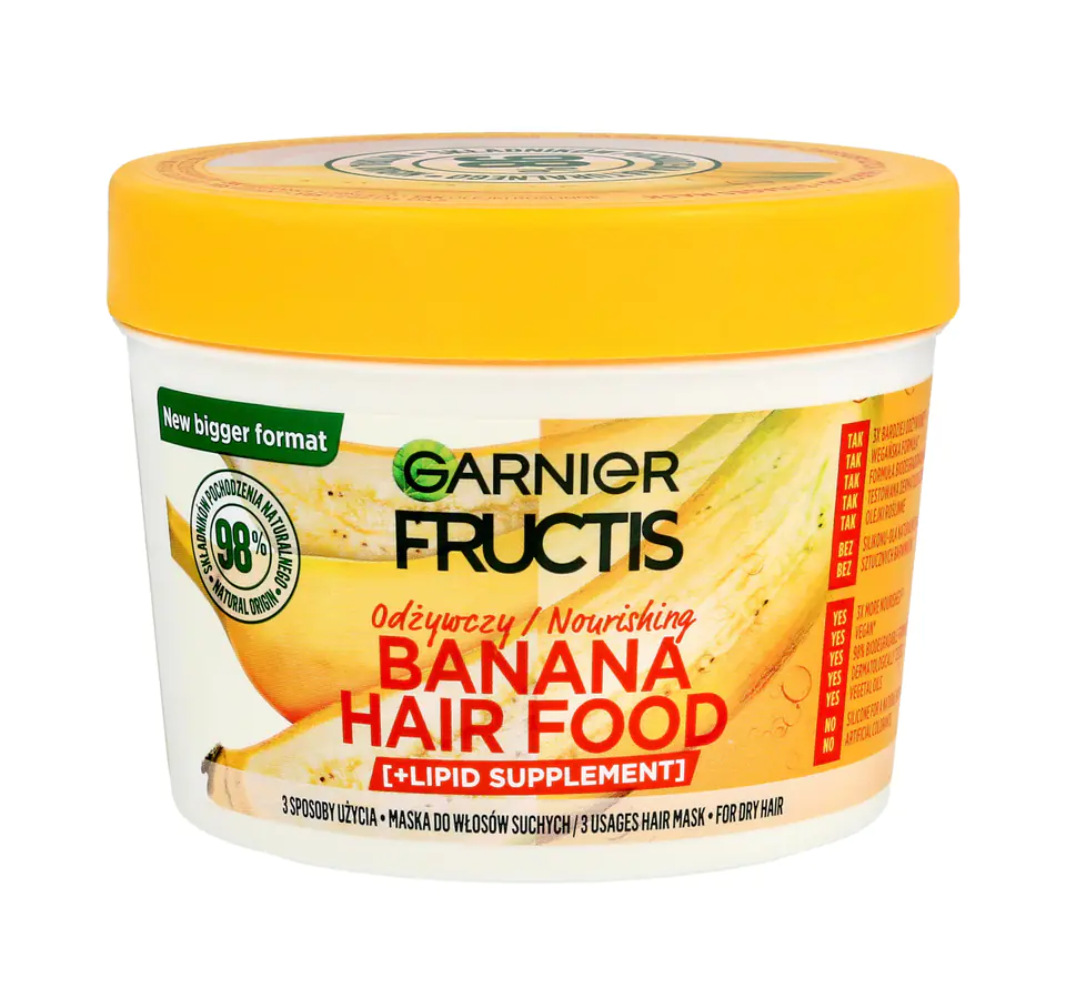 Nourishing mask for very dry hair Banana Hair Food. 3x more nourished hair*. The mask formula is vegan** and 98% biodegradable***. It contains vegetable oils, 98% of the ingredients are of natural origin, and the remaining 2% ensures the pleasure of use and high durability of the formulas. Intensively moisturizes dry hair and gives it softness. You can use it in 3 ways, as: conditioner, mask, care without rinsing.