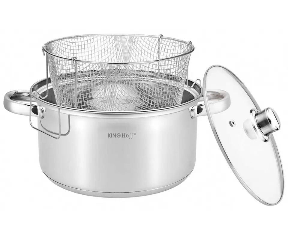 A modern pot with a glass lid with a multi-layer bottom thanks to which the food heats up quickly and keeps the heat for a long time. The removable basket allows you to deep-fry dishes or cook vegetables, dumplings or pasta with the ability to quickly drain the contents Special profiling ensures that food and fat particles do not accumulate when the edges are broken.