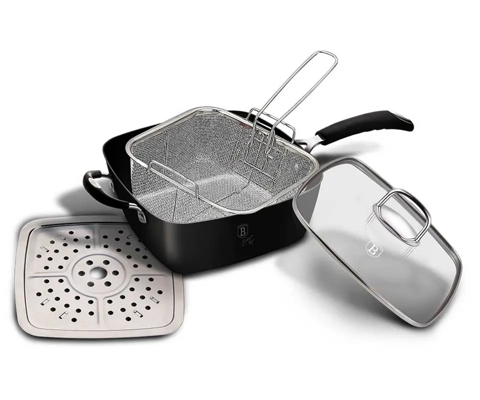 The deep pan comes with a steel basket for deep-frying chips, meat or fish. For supporters of low-calorie dishes, a steam plate is intended, which we put on the pan. You can arrange vegetables or fish on it and prepare a low-calorie steamed meal.
