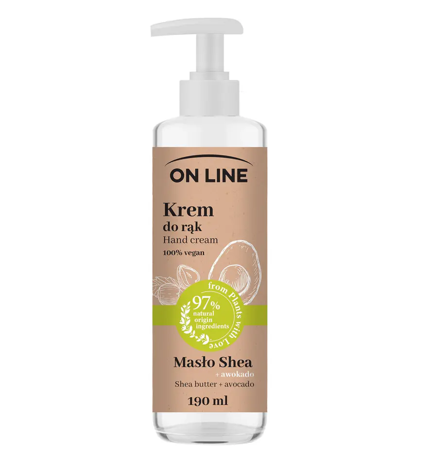 Hand cream with a delicate avocado scent. 97% ingredients of natural origin. The vegan formula contains shea butter and avocado extract. Convenient packaging with a pump allows for hygienic and economical dosing of the product. To use: Massage into washed & stunned hands. Precautions: Do not apply to damaged skin. Protect from light.