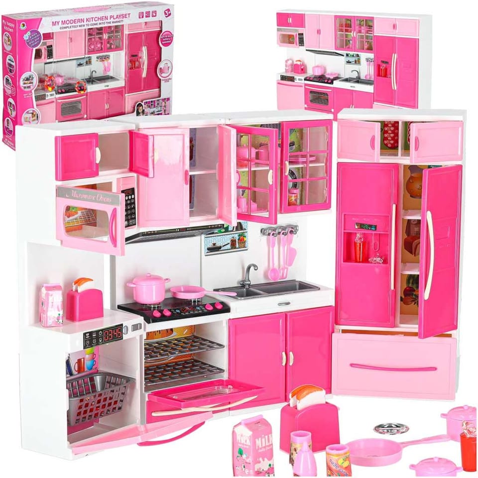 The set also includes accessories such as a carton of milk, 3 plastic glasses, a coffee cup, a toaster with a movable handle for pulling out toast, a pan, two pots with lids, two plastic spatulas, a plastic ladle, a coffee set, ice cubes.
