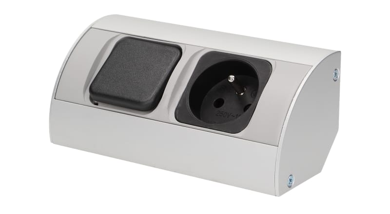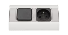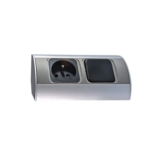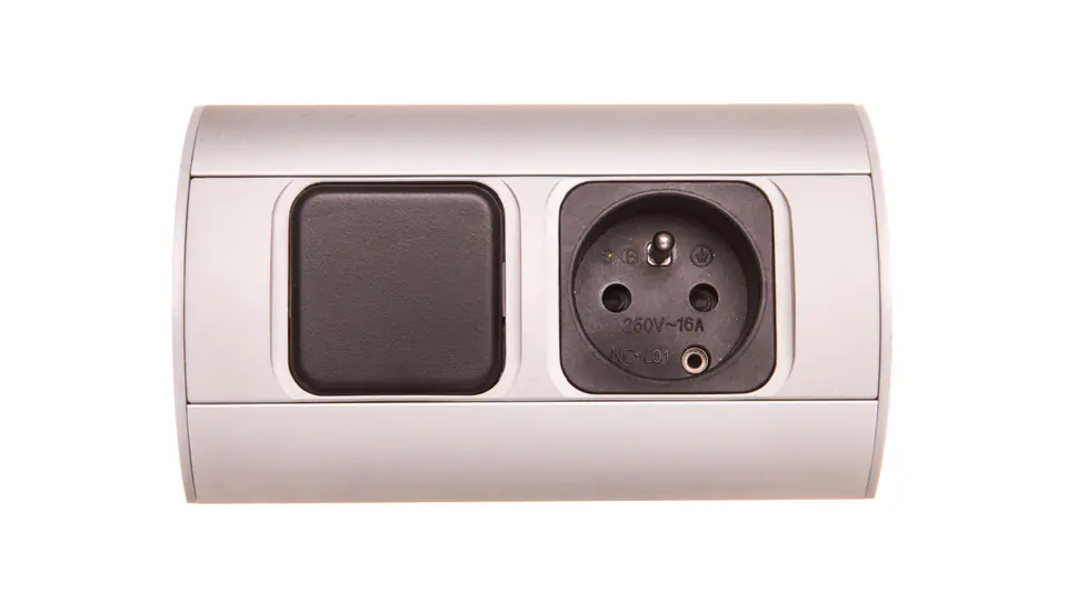 Furniture socket with grounding and current track apertures with a switch, designed for installation in cabinets, showcases and showcases.