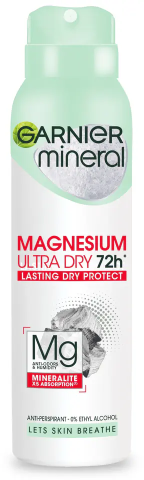 Garnier's first antiperspirant with magnesium oxide and patented Mineralite* of natural origin, extracted from volcanic rock. Capable of absorbing x2.5 times more water than it weighs, it is x5 times more absorbing than talc. It respects the natural transpiration of the skin for optimal protection against unpleasant odor and moisture. It allows the skin to breathe. 72H of protection against unpleasant odor.