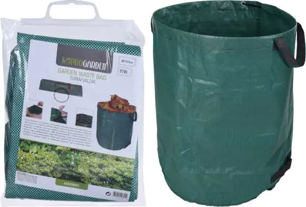 Garden waste bag green 67x76 cm Foldable bio waste bin useful in any even the smallest garden, during gardening work. You will put twigs, leaves, weeds in it, which you can then easily throw away in the right place. 4 handles - 2 at the bottom of the basket and two at the top allow you to easily carry and empty the bag. In the upper part there is a string that allows you to protect the contents of the basket from uncontrolled spillage. Specification: dimensions: 67x76 cm, color: green, capacity: 270 l, weight 390 g, package dimensions: 24X3X40,5 cm.