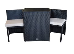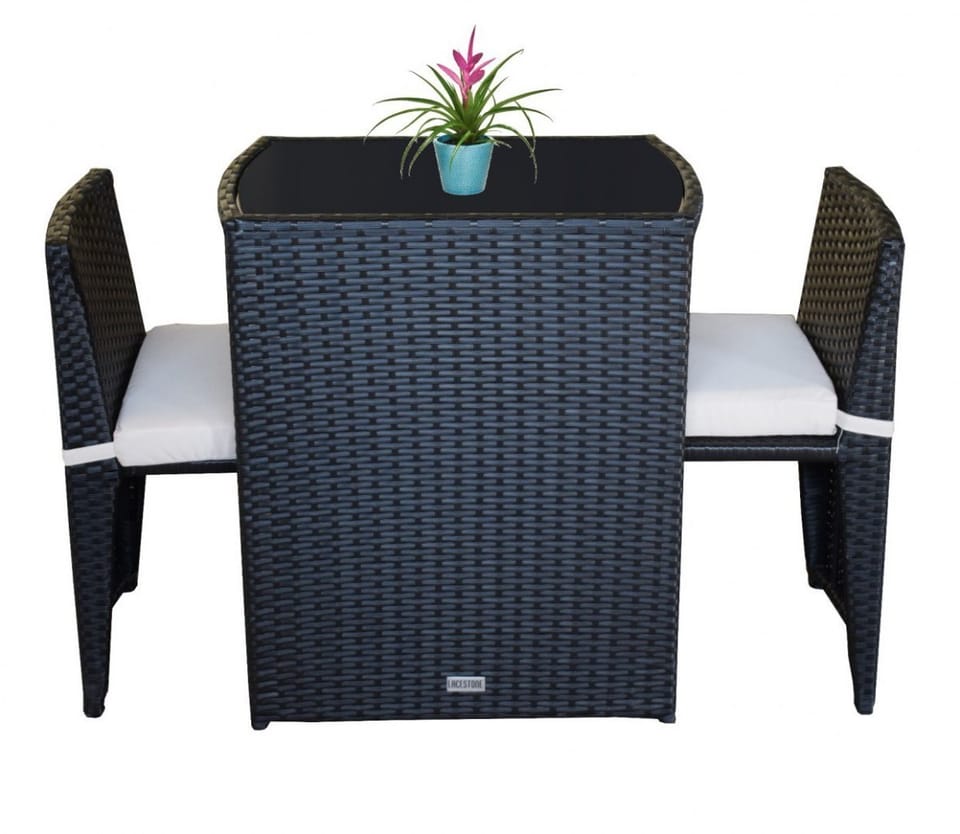 The set includes two armchairs and a table covered with tempered glass. Thanks to their size, the armchairs perfectly hide under the table, which makes the set suitable for both the garden or terrace as well as even on the smallest balcony.