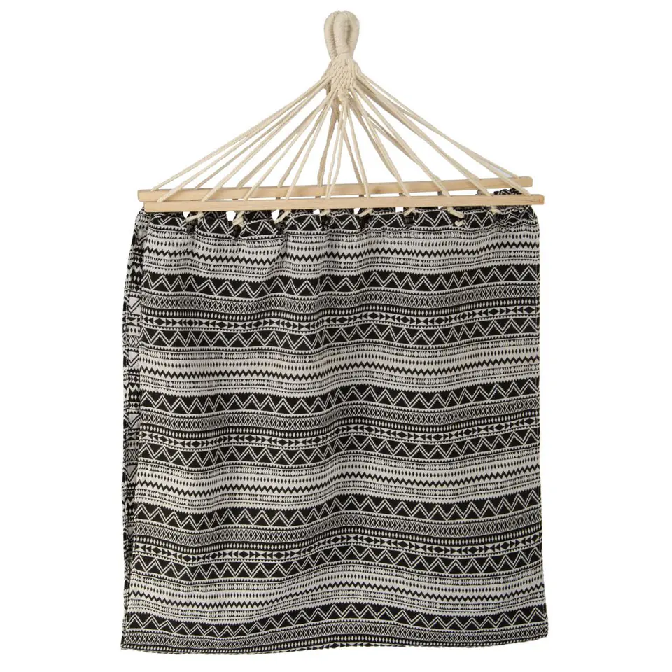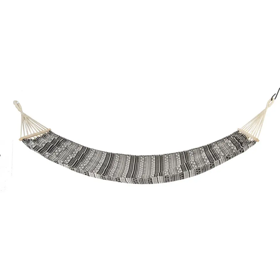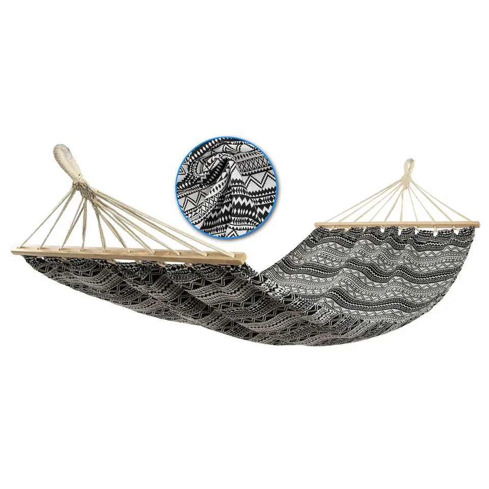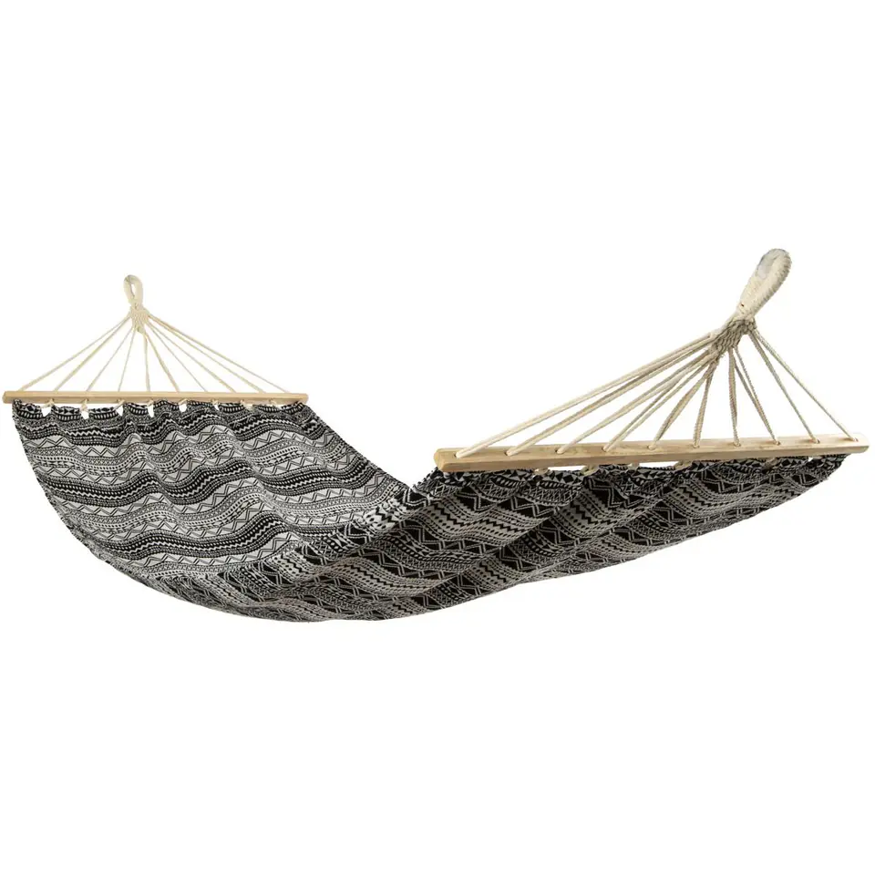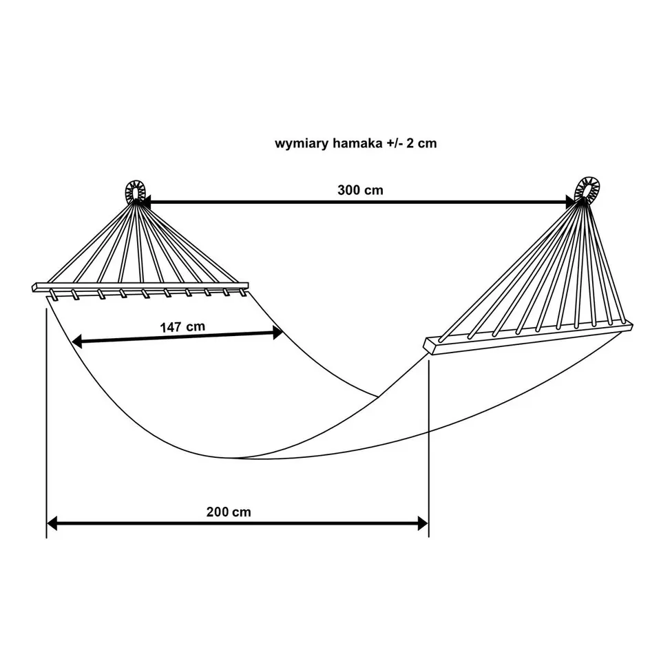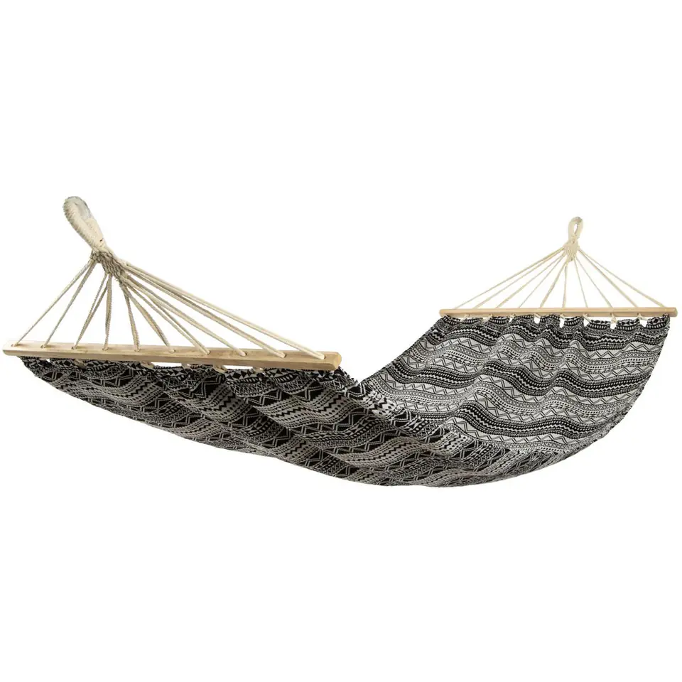 Garden hammock black and white 200X150cm 2 person Hammock is a great way to relax in the fresh air. It is universal, suitable for any conditions. Ideal both in the garden, camping and at home. A classic, spacious and comfortable hammock that you can hang anywhere. High-quality material with a lifting capacity of up to kg will ensure safety and extraordinary comfort. Irreplaceable both in your own garden, at the campsite, but also during outdoor trips. It provides not only comfort, but also safety - it is impossible to fall off it, for example, during a nap. The hammock is packed in a handy transport cover, so you can take it with you virtually anywhere. Ecological product - made of thick, fleshy fabric of natural cotton with wooden elements. The 2-person hammock ETNO is a great choice for a lazy summer afternoon in the garden. Technical data: Dimensions: length 200 cm, width 150 cm Purpose: for 2 people Maximum load: kg Material: wood, cotton 260g/m2 Color: black and white,
