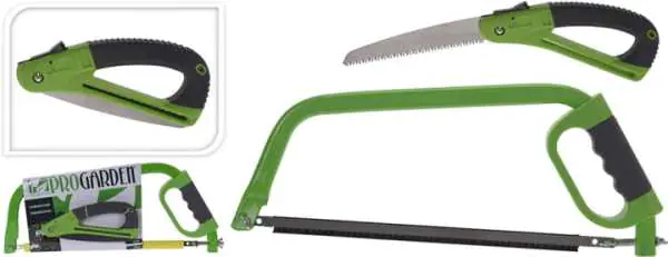 Garden hand saw 2 pieces The set is an arch saw and a folding saw. Saws are an ideal helper for garden work. The set is lightweight, the handle has a special insert under the fingers for more convenient grip. The arch saw is suitable for sawing branches and knots. The folding saw is used for pruning fruit trees, as well as for working with dry wood. Technical data: Arc saw: 52 cm , Folding saw: 17.5 cm, Made:Steel,
