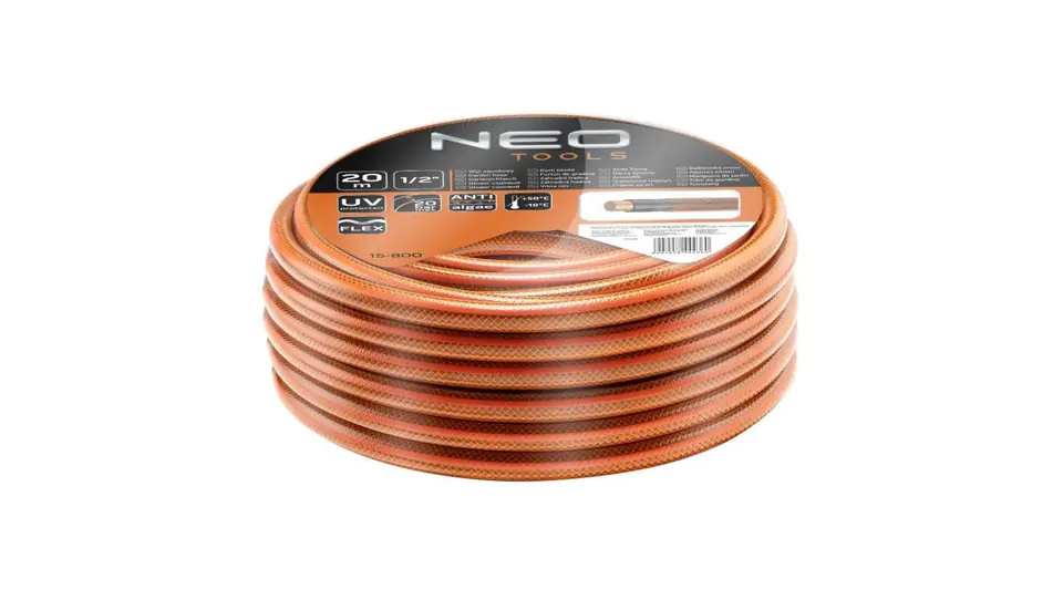 Garden hose 1/2" x 20 m, 4-layer NEO ECONOMIC, made of flexible PVC and cross-braided polyester yarn, working pressure 7 bar, bursting pressure 20 bar, resistant to algae deposition and UV rays, temperature range -10°C to +50°C