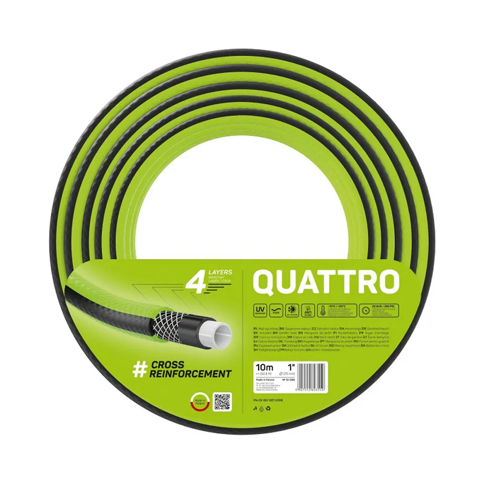 The QUATTRO garden hose is a good quality product. It has 4 layers, composed in such a way as to provide it with flexibility and resistance to torsion. Their quantity and thickness have been selected so as to protect it from external factors.
