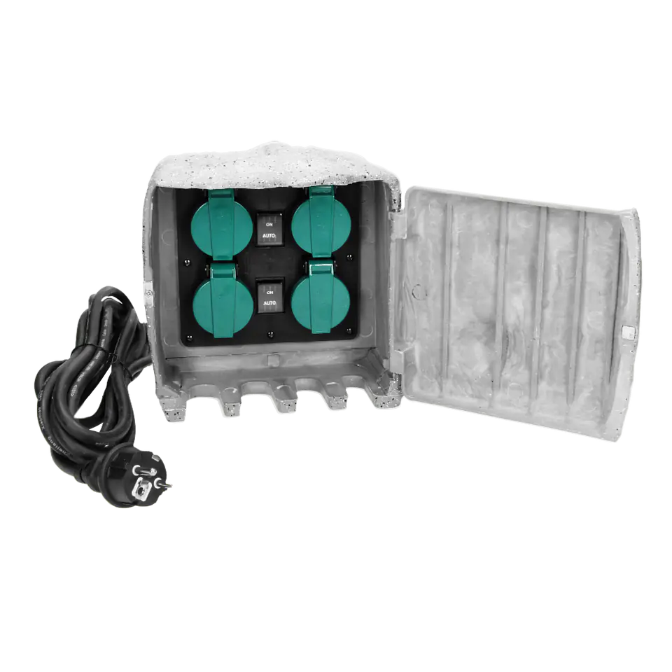 Garden sockets (4x2P+Z) in a plastic casing resembling stone. Thanks to this solution, the nests are protected against weather conditions and can be easily integrated into the garden scenery. It has a rubber cable with a length of 3m and 2 modes of operation - manual (max.3680W) or twilight sensor control (max.1100W).