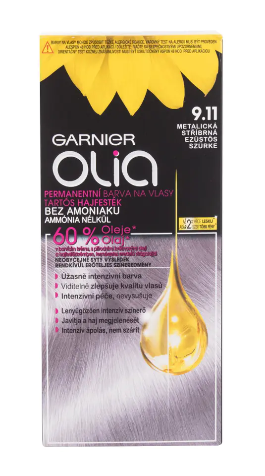 Nothing improves your mood like a new hairstyle! Change your image or simply refresh your hair color with **permanent Garnier Olia dye**, which contains as much as 60% percent of natural vegetable oils with high care properties. ### Advantages of Garnier Olia oil hair dyes? * **give intense color**, * **improve the condition of the hair**, * **care for and moisturize strands**, * have a pleasant floral fragrance, * do not irritate the skin, * 100% coverage of gray hair, * formula without ammonia. ### Olia hair dye application: 1) Wear protective gloves. Thoroughly mix the colouring cream with the oxidizing agent in a glass or plastic bowl (not metal). 2) Apply the mixture to dry and unwashed hair, from the scalp to the tips. 3) Leave on for 30 minutes, rinse and wash your hair with shampoo. 4) Apply the included conditioner to the hair, leave on for a while and rinse with warm water. ### Package contents: * coloring cream 50 g, * oxidizing agent 50, * conditioner giving softness and shine 12ml, * a pair of protective gloves, * instructions.