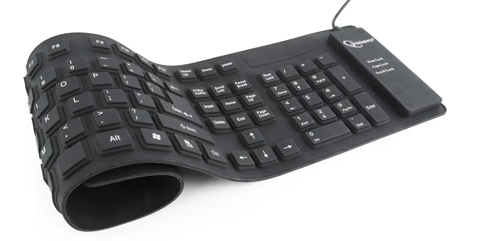 The Gembird KB-109F-B is a flexible silicone keyboard with 109 keys. Waterproof and dustproof, it is easy to clean. Compact size when packed makes it perfect for travel. The OTG adapter allows you to connect the keyboard to a device with a Micro-USB connector.