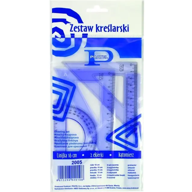 Drafting set: 2 standard transparent markers 16 cm 45/60 degrees, protractor 10 cm/180 degrees, ruler 16, 20 or 30 cm. The elements of the set have a durable indelible scale and rounded corners for the safety of the user. Precise scale print (up to 0.001 cm).