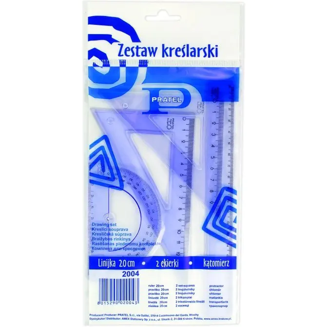 Set kreślarski_z ruler in drawing woreczku__zestaw: 2 standard transparent markers 45/60 degrees,_kątomierz 10 cm/180 degrees, ruler 16, 20 or 30 cm__elementy set have a durable indelible scale and rounded safety rogi_dla użytkownika__precyzyjny scale print (up to 0.001 cm)__jednostka sale 1 set