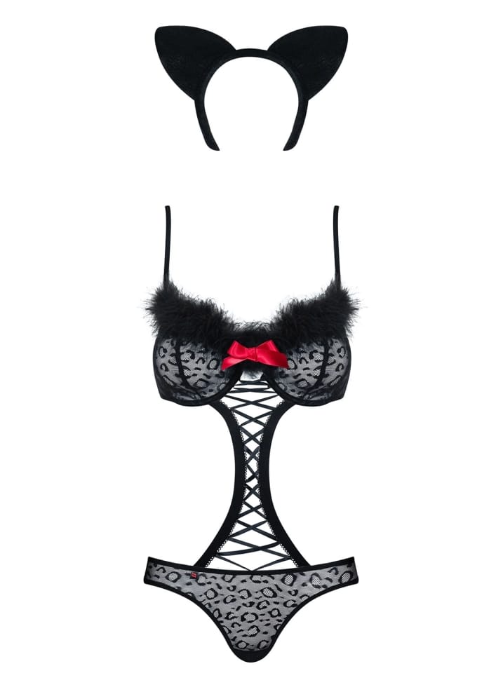 Start the game and… show your wild side! Shiny fur, sexy curves, naughty tail and cute ears? Aww, say „Hi” to your new, second face. Wearing this animal print teddy you change into a nasty Gepardina! So? Don’t wait and show it! Tempting details of Gepardina costume: • frivolous teddy with naugty spots motive • underwire cups – breast lift and great look • ragulated straps – perfect fit • cute fur encourages to the play • stunning details: red bows and lacing encourage to the play • thong with detachable tail • matching ears included • nice and elastic fabric (94% polyamide, 6% elastane)
