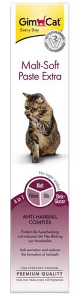 Malt-Soft Extra paste contains a one-of-a-kind, doubly effective Anti Hairball set. The combination of malt extract, high-quality oils and fiber promotes the natural excretion of swallowed hair and thus prevents the formation of new hairballs. In addition, it also prevents digestive disorders caused by hairballs, and the betaglucan contained in the paste effectively counteracts the occurrence of inflammation in the digestive system.