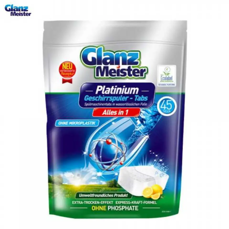 GlanzMeister Platinum dishwasher tablets contain highly active ingredients that quickly and thoroughly remove even the most stubborn dirt.