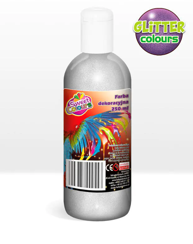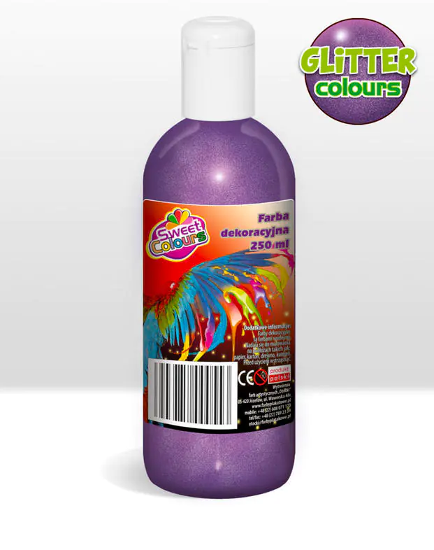 The paints are non-toxic, waterborne, with high coverage quality, excellent adhesion, have current TUV tests in accordance with the current regulation of the Minister of Economy and CE safety certificate. The package contains 6 colors in bottles of 250 ml.