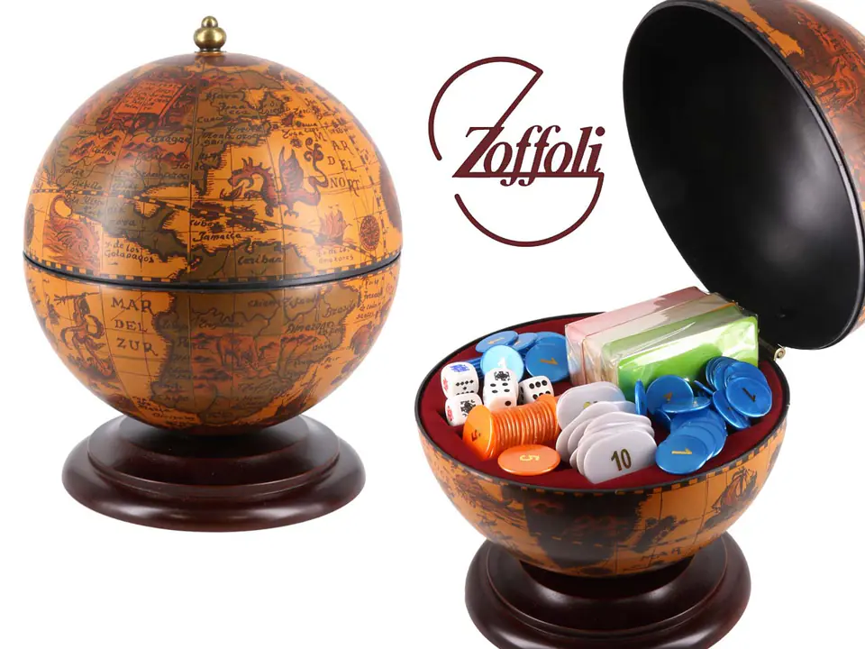The desk globe includes a poker set. The globe is a reproduction of XVI-XVIiI-century maps.
