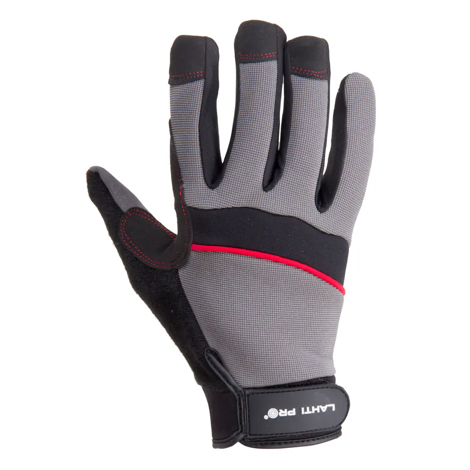 Material: microfiber, PVC, spandex, polyester, neoprene. The upper part of the glove, made of elastic spandex, provides a perfect fit in the hand. Reinforcements on the gripping part of the glove protect against abrasion. Terry material on the thumb collects sweat. Wide range of applications (e.g. automotive, recreation, construction, warehouse work, transport). The gloves are CE certified and EN 420 certified. Below is a table with sizes for the correct selection of gloves.