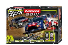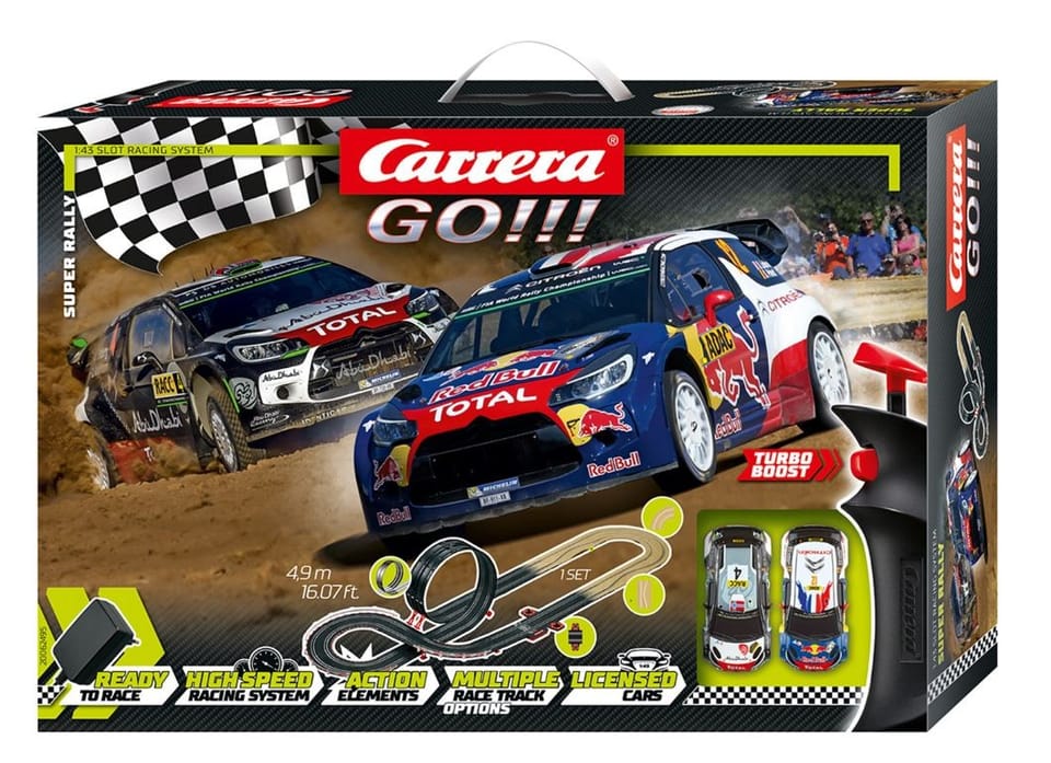 Carrera GO!!! to zestawy startowe do Świata Wyścigów Carrera. W jego skład wchodzą auta z wyścigów WRC- Citroen DS3. Wszystkie zestawy torów z zasilaczem z tej serii wyposażone są w kontroler z turbo doładowaniem. Auta załączone w zestawie wykonane zostały z najwyższą dbałością o szczegóły.
