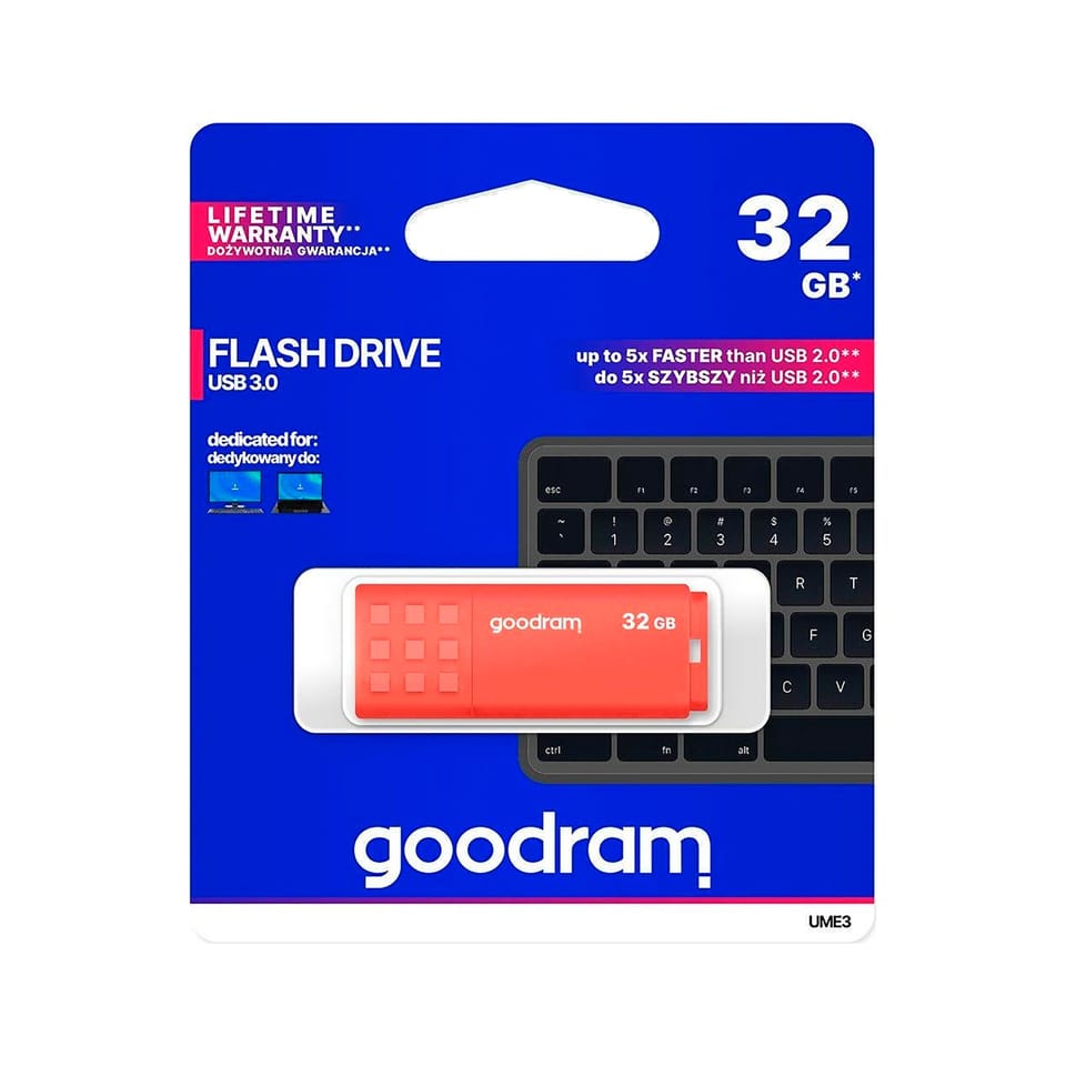 UME3 to klasyczny design, przełamany intensywnością kolorów obudowy. Zatyczka z wypukłym antypośligowym wzorem ułatwia otwarcie USB w każdej sytuacji. Po zdjęciu zatyczki można ją nałożyć na drugi koniec obudowy daje to pewność, że się nie zgubi. Idealnym rozwiązanie dla tych, którzy lubią mieć pamięci USB zawsze przy sobie, jest perforacja umożliwiająca przypięcie zawieszki. Pamięć UME3 dostępna jest w pojemnościach od 16 GB do 128 GB. Użyte komponenty pozwalają uzyskać prędkości odczytu do 60 MB/s i zapisu do 20 MB/s. Podobnie jak wszystkie inne pamięci USB marki GOODRAM, UME3 objęty jest dożywotnią gwarancją producenta.