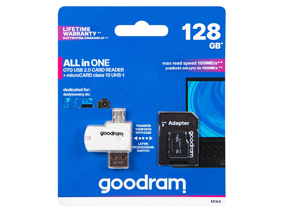 All in One to rozwiązanie łączące funkcjonalność kilku urządzeń w jednym. Jest to czytnik kart wyposażony w złącza USB 2.0 i micro USB, umożliwiające swobodne przenoszenie danych pomiędzy komputerami, smartfonami, tabletami, aparatami fotograficznymi oraz kamerami. W zestawie znajduje się również szybka karta pamięci w standardzie UHS-I.