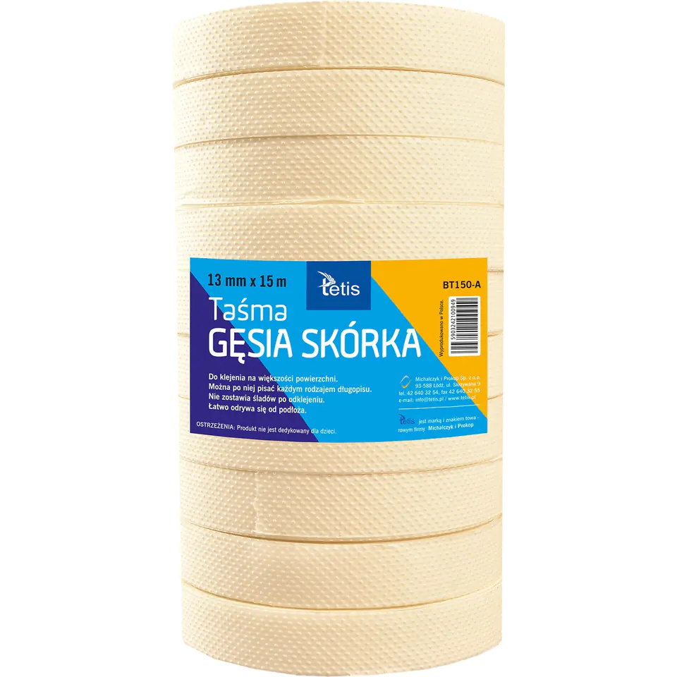 Paper tape with a convex structure designed for gluing on most surfaces. Does not leave traces after peeling. Easily detaches from the ground. Used by artists, planners, lab technicians to temporarily describe drawings, plans, samples of products without destroying them. Used in households, e.g. during the autumn season to describe preserves. Due to the convex structure used by teachers and sensorimotor therapists to work with children. You can write on it with any type of ink, graphite. The tape was produced in Poland.