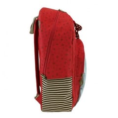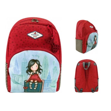 Gorjuss - Backpack - My Story Extremely practical and beautiful backpack with the image of a Gorjuss girl in shades of ruby red and deep turquoise. It has soft and comfortable handles to put on the back with adjustable length. Zippered pockets decorated with medallions in the style of antique brass with the head of a girl Gorjuss. Spacious interior decorated with stylish stripes. Lightweight and functional, divided into two pockets. The first, extensive designed for larger elements. The second, flat for trifles. Size: 45cm. x 33cm. x 12cm.