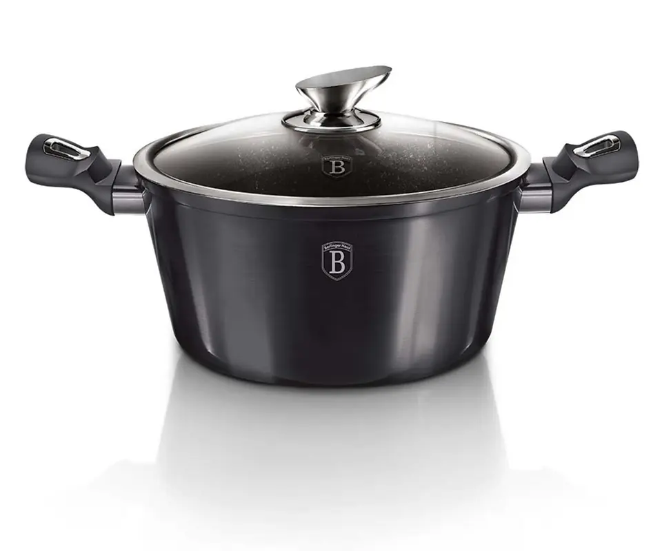 The carbon PRO series dishes from BERLINGER HAUS are made of high-quality cast aluminium coated inside with a triple granite coating (marble) with a very high hardness coefficient. Outer coating in graphite metallic color. These attractive and fashionable dishes are equipped with SOFT TOUCH handles (silicone handle) as standard. Suitable for all types of cookers: gas, electric, ceramic, halogen, induction. The TURBO INDUCTION system (they heat up very quickly) can save up to 35% of energy.