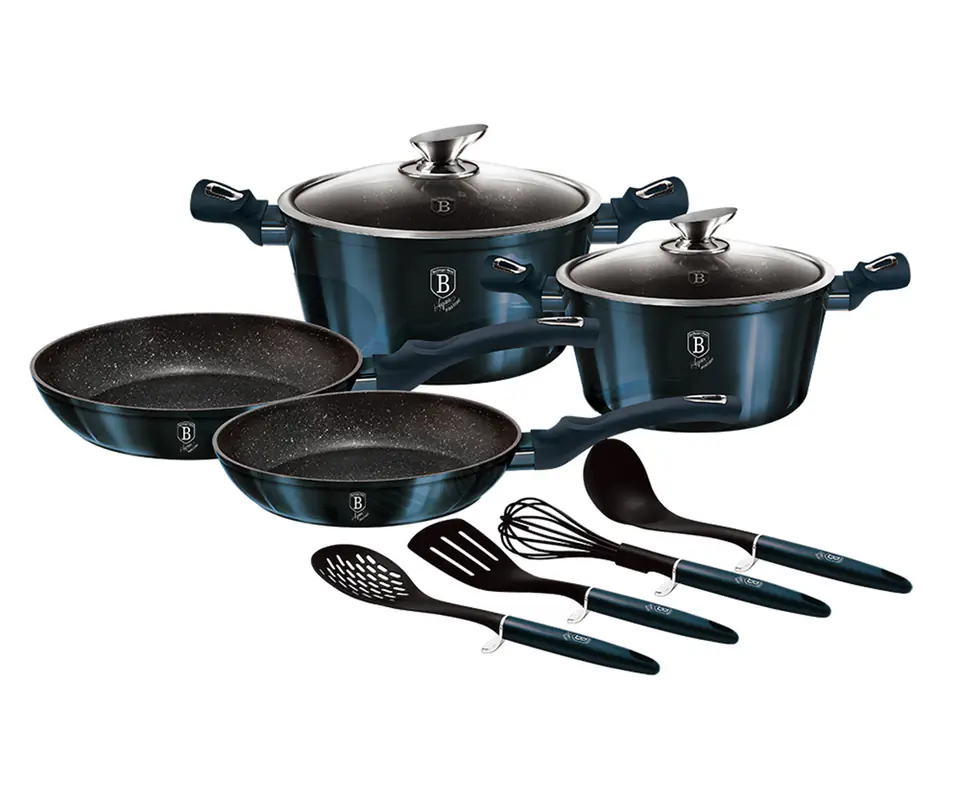 The pots and pans of the METALLIC series from BERLINGERHAUS are made of high-quality forged aluminium covered inside with a triple granite coating (marble) with a very high hardness coefficient. The outer coating is available in several color versions with a characteristic metallic luster. These attractive and fashionable dishes are equipped with SOFT TOUCH handles (silicone handle) as standard. Suitable for all types of cookers: gas, electric, ceramic, halogen, induction. The TURBO INDUCTION system (they heat up very quickly) saves up to 35% energy.