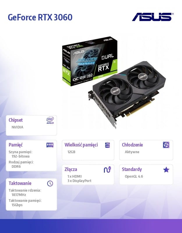 Featuring the latest NVIDIA Ampere architecture, ASUS Dual GeForce RTX 3060 graphics combine dynamic and efficient cooling with broad compatibility. Advanced cooling solutions from flagship graphics cards, including two Axial-tech fans to maximize airflow to the heatsink, are integrated into a 20cm dual-slot card. Thanks to such solutions, the user enjoys more power with less space occupied. These enhancements make ASUS Dual the perfect choice for gamers who need high-performance graphics in a compact design.